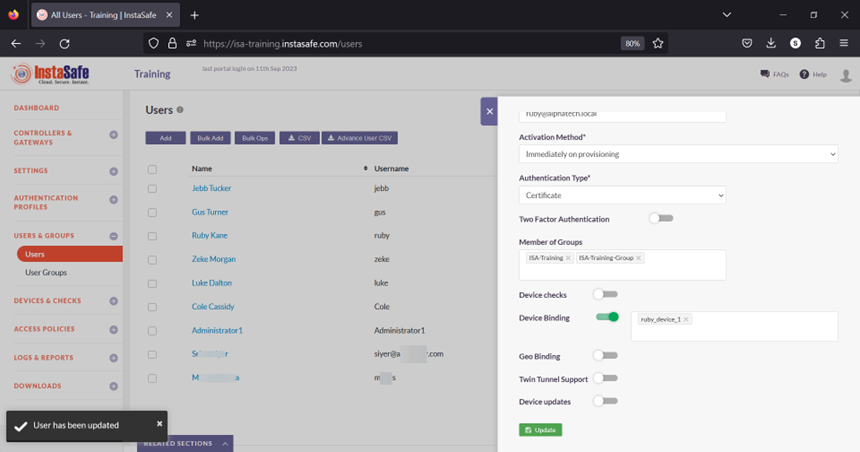 Using these parameters, it is possible to enforce Device Binding on users. Device Binding will ensure that the users are allowed to make connections only from those devices registered in the ISA web console. This will eliminate attacks due to stolen or shared passwords. A user can be bound to multiple devices.