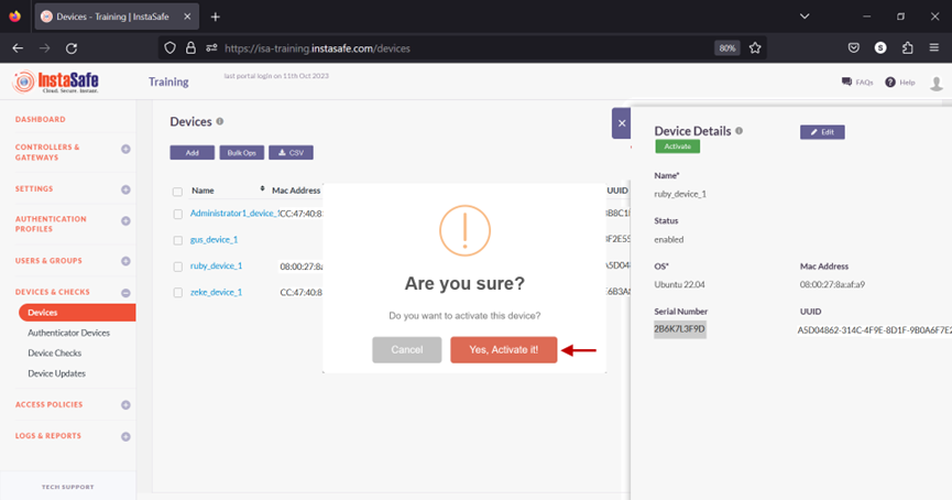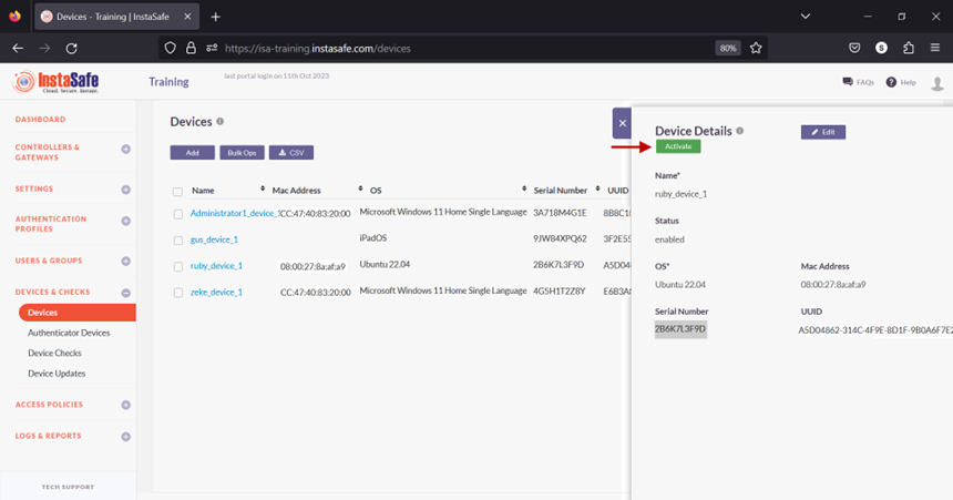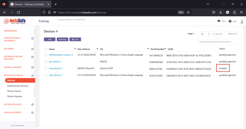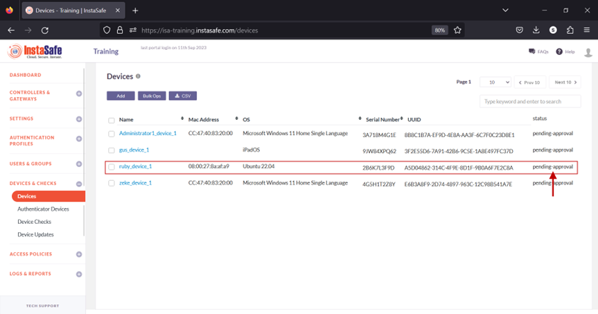 Device Registration occurs when Instasafe Secure Access (ISA) automatically captures certain device identification details when an ISA User Agent connects to the ISA Controller. The information captured during Device Registration are: 1. MAC Address of the physical network adapter 1. Operating System Name 1. BIOS Serial Number 1. Universally Unique Identifier (UUID)
