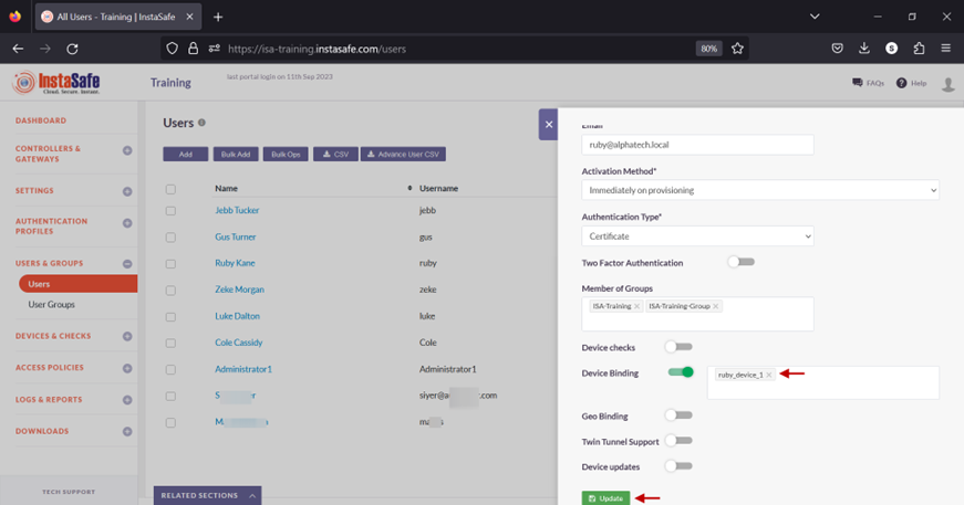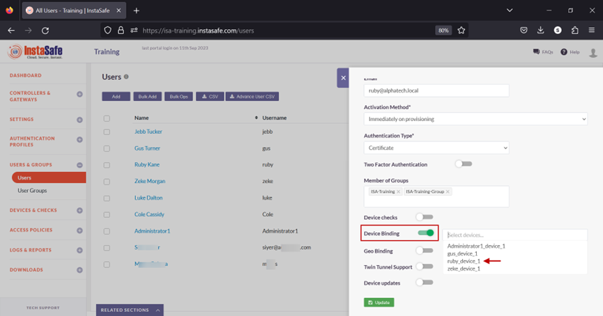 • Scroll down and toggle the Device Binding button to enable it. Then click inside the Select devices box to list the device names. Select the device name for the user. In this example, ruby_device_1.