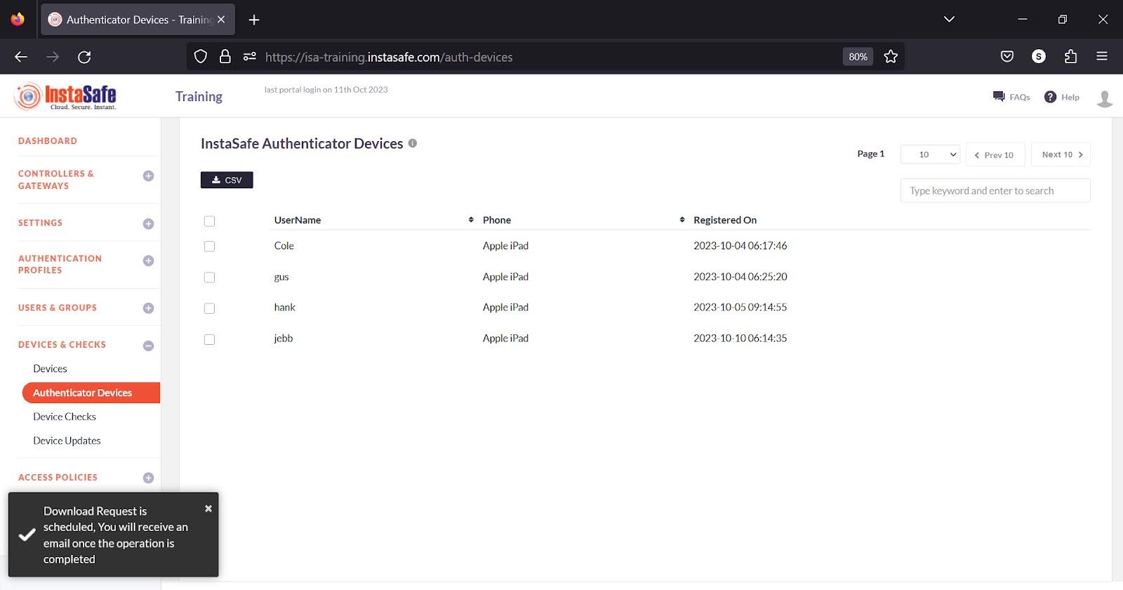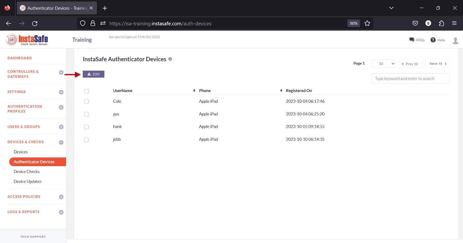 Administrators can download the user list by clicking the CSV button at the top.